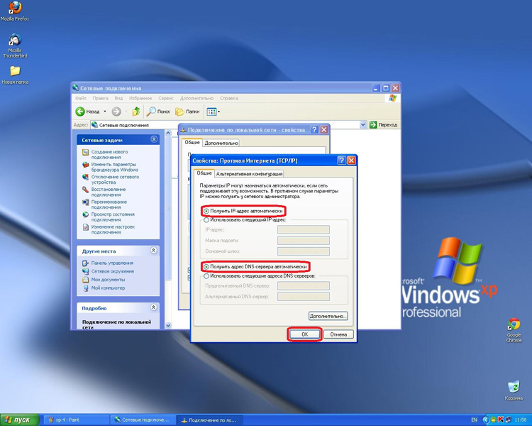 5. В открывшемся окне «Свойства: протокол интернета (TCP/IP)» поставьте точки «Получить IP-адрес автоматически» и «Получить адрес DNS-сервера автоматически». Затем нажмите «ОК» и в предыдущем окне «Подключение по локальной сети - свойства» тоже нажмите «ОК».